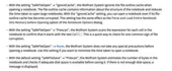 - With the setting "SafeFileOpen""IgnoreCache", the Wolfram System ignores the file outline cache when opening a notebook. The file outline cache contains information about the structure of the notebook and reduces the time taken to open large notebooks. With the "IgnoreCache" setting, you can open a notebook even if its file outline cache has become corrupted. This setting has the same effect as the Parse and Load Entire Notebook into Memory before Opening option of the Notebook Options dialog.