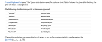 - ProbabilityScalePlot[data,"dist"] uses distribution-specific scales so that if data follows the given distribution, the plot will lie on a straight line.