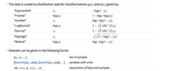{x1,x2,…} list of samples {Quantity[x1,unit],Quantity[x2,unit],…} samples with units <|k1e1,k2e2,…|> association of keys and samples WeightedData[…],EventData[…] augmented datasets TimeSeries[…],EventSeries[…],TemporalData[…] time series, event series, and temporal data w[{e1,e2,…},…] wrapper applied to a whole dataset w[{data1,data2,…}] wrapper applied to all datasets - The form w[data] provides a wrapper w to be applied to the resulting graphics primitives.