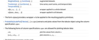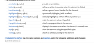 Annotation[e,label] provide an annotation Button[e,action] define an action to execute when the element is clicked EventHandler[e,…] define a general event handler for the element Highlighted[datai,effect] dynamically highlight fi with an effect Highlighted[datai,Placed[effect,pos]] statically highlight fi with an effect at position pos Hyperlink[e,uri] make the element act as a hyperlink PopupWindow[e,cont] attach a popup window to the element StatusArea[e,label] display in the status area when the element is moused over Style[e,opts] show the element using the specified styles Tooltip[e,label] attach an arbitrary tooltip to the element - ProbabilityScalePlot has the same options as Graphics, with the following additions and changes: [List of all options]