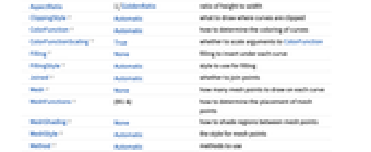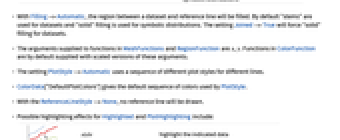 AspectRatio 1/GoldenRatio ratio of height to width ClippingStyle Automatic what to draw where curves are clipped ColorFunction Automatic how to determine the coloring of curves ColorFunctionScaling True whether to scale arguments to ColorFunction Filling None filling to insert under each curve FillingStyle Automatic style to use for filling Joined Automatic whether to join points Mesh None how many mesh points to draw on each curve MeshFunctions {#1&} how to determine the placement of mesh points MeshShading None how to shade regions between mesh points MeshStyle Automatic the style for mesh points Method Automatic methods to use PerformanceGoal $PerformanceGoal aspects of performance to try to optimize PlotHighlighting Automatic highlighting effect for curves PlotLegends None legends for data points PlotMarkers None markers to use to indicate each point for datasets PlotRange Automatic range of values to include PlotRangeClipping True whether to clip at the plot range PlotStyle Automatic graphics directives to specify the style for each object PlotTheme $PlotTheme overall theme for the plot ReferenceLineStyle Automatic style for the reference line ScalingFunctions None how to scale individual coordinates WorkingPrecision MachinePrecision the precision used in internal computations for symbolic distributions - With Filling->Automatic, the region between a dataset and reference line will be filled. By default "stems" are used for datasets and "solid" filling is used for symbolic distributions. The setting Joined->True will force "solid" filling for datasets.