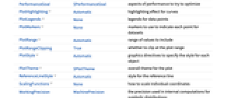 AlignmentPoint Center the default point in the graphic to align with AspectRatio 1/GoldenRatio ratio of height to width Axes False whether to draw axes AxesLabel None axes labels AxesOrigin Automatic where axes should cross AxesStyle {} style specifications for the axes Background None background color for the plot BaselinePosition Automatic how to align with a surrounding text baseline BaseStyle {} base style specifications for the graphic ClippingStyle Automatic what to draw where curves are clipped ColorFunction Automatic how to determine the coloring of curves ColorFunctionScaling True whether to scale arguments to ColorFunction ContentSelectable Automatic whether to allow contents to be selected CoordinatesToolOptions Automatic detailed behavior of the coordinates tool Epilog {} primitives rendered after the main plot Filling None filling to insert under each curve FillingStyle Automatic style to use for filling FormatType TraditionalForm the default format type for text Frame False whether to put a frame around the plot FrameLabel None frame labels FrameStyle {} style specifications for the frame FrameTicks Automatic frame ticks FrameTicksStyle {} style specifications for frame ticks GridLines None grid lines to draw GridLinesStyle {} style specifications for grid lines ImageMargins 0. the margins to leave around the graphic ImagePadding All what extra padding to allow for labels etc. ImageSize Automatic the absolute size at which to render the graphic Joined Automatic whether to join points LabelStyle {} style specifications for labels Mesh None how many mesh points to draw on each curve MeshFunctions {#1&} how to determine the placement of mesh points MeshShading None how to shade regions between mesh points MeshStyle Automatic the style for mesh points Method Automatic methods to use PerformanceGoal $PerformanceGoal aspects of performance to try to optimize PlotHighlighting Automatic highlighting effect for curves PlotLabel None an overall label for the plot PlotLegends None legends for data points PlotMarkers None markers to use to indicate each point for datasets PlotRange Automatic range of values to include PlotRangeClipping True whether to clip at the plot range PlotRangePadding Automatic how much to pad the range of values PlotRegion Automatic the final display region to be filled PlotStyle Automatic graphics directives to specify the style for each object PlotTheme $PlotTheme overall theme for the plot PreserveImageOptions Automatic whether to preserve image options when displaying new versions of the same graphic Prolog {} primitives rendered before the main plot ReferenceLineStyle Automatic style for the reference line RotateLabel True whether to rotate y labels on the frame ScalingFunctions None how to scale individual coordinates Ticks Automatic axes ticks TicksStyle {} style specifications for axes ticks WorkingPrecision MachinePrecision the precision used in internal computations for symbolic distributions