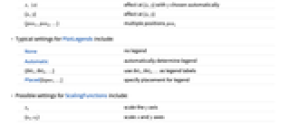 None no legend Automatic automatically determine legend {lbl1,lbl2,…} use lbl1, lbl2, … as legend labels Placed[lspec,…] specify placement for legend - Possible settings for ScalingFunctions include: