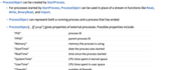 - For processes started by StartProcess, ProcessObject can be used in place of a stream in functions like Read, Write, BinaryRead, and Import.