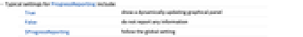 True show a dynamically updating graphical panel False do not report any information $ProgressReporting follow the global setting