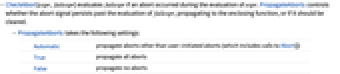 Automatic propagate aborts other than user-initiated aborts (which includes calls to Abort[]) True propagate all aborts False propagate no aborts