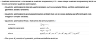 - Quadratic optimization is typically used in problems such as parameter fitting, portfolio optimization and geometric distance problems.