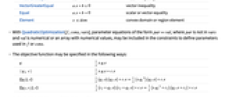 convex domain or region element - With QuadraticOptimization[f,cons,vars], parameter equations of the form parval, where par is not in vars and val is numerical or an array with numerical values, may be included in the constraints to define parameters used in f or cons.