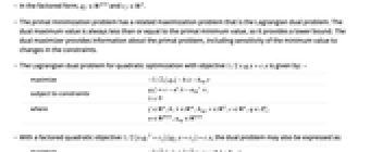 . - The primal minimization problem has a related maximization problem that is the Lagrangian dual problem. The dual maximum value is always less than or equal to the primal minimum value, so it provides a lower bound. The dual maximizer provides information about the primal problem, including sensitivity of the minimum value to changes in the constraints.
