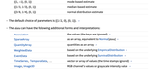 Association the values (the keys are ignored) » SparseArray as an array, equivalent to Normal[data] » QuantityArray quantities as an array » WeightedData based on the underlying EmpiricalDistribution » EventData based on the underlying SurvivalDistribution » TimeSeries, TemporalData, … vector or array of values (the time stamps ignored) » Image,Image3D RGB channel's values or grayscale intensity value » Audio amplitude values of all channels » DateObject, TimeObject list of dates or list of times » - QuartileDeviation[dist] is given by InterquartileRange[dist]/2. »