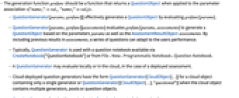 - QuestionGenerator[params,genfunc][assessments] evaluates genfunc[params,assessments] to generate a QuestionObject based on the parameters params as well as the AssessmentResultObject assessments. By including previous results in assessments, a series of questions can adapt to the users performance.