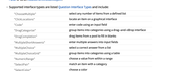"ChooseMultiple" select any number of items from a defined list "ClickLocations" locate an item on a graphical interface "Code" enter code using an input field "DragCategorize" group items into categories using a drag-and-drop interface "DragCompletion" drag items from a pool to fill in blanks "MultipleShortAnswers" enter multiple answers into input fields "MultipleChoice" select a correct answer from a list "MultipleChoiceGrid" group items into categories using a table "NumericRange" choose a value from within a range "SelectPair" match an item with a category "SelectColor" choose a color "SelectCompletion" choose text to fill in a blank "ShortAnswer" enter an answer using an input field "Sort" order a list using a drag-and-drop interface "TextCompletion" type text to fill in a blank "TrueFalse" determine whether a question is true or false - QuestionObject supports the following options: