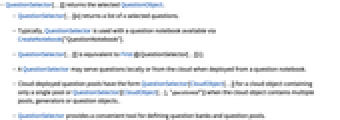- Typically, QuestionSelector is used with a question notebook available via CreateNotebook["QuestionNotebook"].