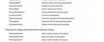 "ArrivalRate" arrival rate for the queueing system "ArrivalDistribution" arrival distribution for the queueing system "DataSource" whether data is from the queue or queueing network "InitialState" initial state of the queueing system "NetworkType" type of queueing network "NodeCount" number of nodes in the queueing network "QueueDiagram" diagram of the queueing system "QueueNotation" Kendall notation for the queue "SelectedNode" selected node in the queueing network "ServiceChannels" number of service channels "ServiceRate" service rate for each server "ServiceDistribution" service distribution for each server "SummaryTable" summary of properties "SystemCapacity" maximum capacity of the queueing system "Throughput" departure rate for the queueing system "UtilizationFactor" fraction of time the servers are busy - Stationary (or steady-state) performance measures include: