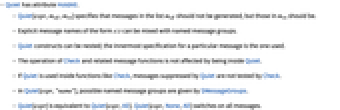 - If Quiet is used inside functions like Check, messages suppressed by Quiet are not tested by Check.
