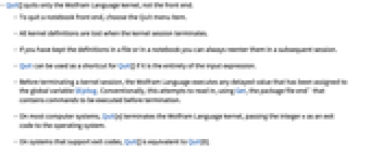 - Quit[] quits only the Wolfram Language kernel, not the front end.