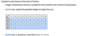 Wolfram Language. 1988. "Quotient." Wolfram Language & System Documentation Center. Wolfram Research. Last Modified 2002. https://reference.wolfram.com/language/ref/Quotient.html.
