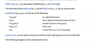 - RGBColor[r,g,b,a] is equivalent to {RGBColor[r,g,b],Opacity[a]}.
