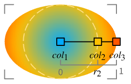 - RadialGradientFilling[{r1,r2,…,rn}{col1,col2,…,coln}] specifies colors coli to use at the scaled radius ri taken to be relative to the width of the graphic object.