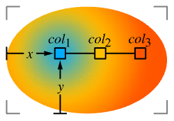 radiates from the center point {x,y} in concentric axis-aligned ellipsoids with semiaxes length proportional to ri.