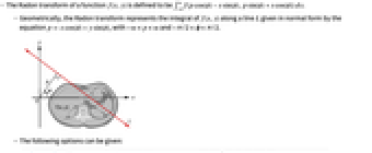 Wolfram Language. (2017). RadonTransform. Wolfram Language & System Documentation Center. Retrieved from https://reference.wolfram.com/language/ref/RadonTransform.html