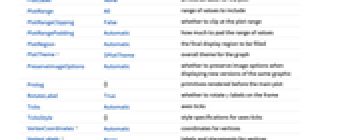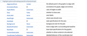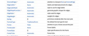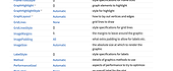 AlignmentPoint Center the default point in the graphic to align with AnnotationRules {} annotations for graph, edges and vertices AspectRatio Automatic ratio of height to width Axes False whether to draw axes AxesLabel None axes labels AxesOrigin Automatic where axes should cross AxesStyle {} style specifications for the axes Background None background color for the plot BaselinePosition Automatic how to align with a surrounding text baseline BaseStyle {} base style specifications for the graphic ContentSelectable Automatic whether to allow contents to be selected CoordinatesToolOptions Automatic detailed behavior of the coordinates tool DirectedEdges Automatic whether to interpret Rule as DirectedEdge EdgeLabels None labels and label placements for edges EdgeLabelStyle Automatic style to use for edge labels EdgeShapeFunction Automatic generate graphic shapes for edges EdgeStyle Automatic style used for edges EdgeWeight Automatic weights for edges Epilog {} primitives rendered after the main plot FormatType TraditionalForm the default format type for text Frame False whether to put a frame around the plot FrameLabel None frame labels FrameStyle {} style specifications for the frame FrameTicks Automatic frame ticks FrameTicksStyle {} style specifications for frame ticks GraphHighlight {} graph elements to highlight GraphHighlightStyle Automatic style for highlight GraphLayout Automatic how to lay out vertices and edges GridLines None grid lines to draw GridLinesStyle {} style specifications for grid lines ImageMargins 0. the margins to leave around the graphic ImagePadding All what extra padding to allow for labels etc. ImageSize Automatic the absolute size at which to render the graphic LabelStyle {} style specifications for labels Method Automatic details of graphics methods to use PerformanceGoal Automatic aspects of performance to try to optimize PlotLabel None an overall label for the plot PlotRange All range of values to include PlotRangeClipping False whether to clip at the plot range PlotRangePadding Automatic how much to pad the range of values PlotRegion Automatic the final display region to be filled PlotTheme $PlotTheme overall theme for the graph PreserveImageOptions Automatic whether to preserve image options when displaying new versions of the same graphic Prolog {} primitives rendered before the main plot RotateLabel True whether to rotate y labels on the frame Ticks Automatic axes ticks TicksStyle {} style specifications for axes ticks VertexCoordinates Automatic coordinates for vertices VertexLabels None labels and placements for vertices VertexLabelStyle Automatic style to use for vertex labels VertexShape Automatic graphic shape for vertices VertexShapeFunction Automatic generate graphic shapes for vertices VertexSize Medium size of vertices VertexStyle Automatic styles for vertices VertexWeight Automatic weights for vertices