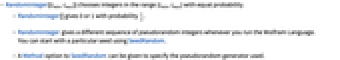 - RandomInteger[{imin,imax}] chooses integers in the range {imin,imax} with equal probability.