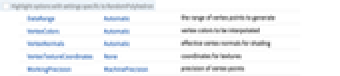 DataRange Automatic the range of vertex points to generate VertexColors Automatic vertex colors to be interpolated VertexNormals Automatic effective vertex normals for shading VertexTextureCoordinates None coordinates for textures WorkingPrecision MachinePrecision precision of vertex points