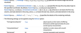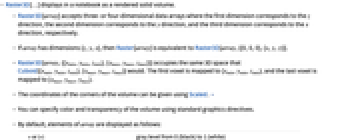 direction, respectively. - If array has dimensions {z,y,x}, then Raster[array] is equivalent to Raster3D[array,{{0,0,0},{x,y,z}}].