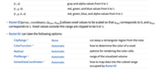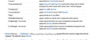 GrayLevel apply gray-level color space RGBColor apply RGB or RGBA color space Hue apply HSB color space CMYKColor apply CMYK color space Opacity apply opacities only with all colors set to White "XYZ" apply XYZ color space "LUV" apply LUV color space "LAB" apply LAB color space ColorData["scheme"] apply the specified ColorData function "scheme" equivalent to ColorData["scheme"] "GrayLevelOpacity" apply GrayLevel with Opacity; voxels with values near 0 will be transparent, while voxels with values near 1 will be opaque "HueOpacity" apply Hue with Opacity "schemeOpacity" apply ColorData["scheme"] with Opacity "XRay" approximate an X-ray effect "WhiteBlackOpacity" apply a white-to-black color component with opacity {"HighRange",threshold} make values less than threshold completely transparent and apply the Opacity function otherwise {"LowRange",threshold} make values greater than threshold completely transparent and apply the Opacity function otherwise - Raster3D[array,…,ClipRange->{{xmin,xmax},{ymin,ymax},{zmin,zmax}}] specifies the volume range that will be clipped. The default value is None.