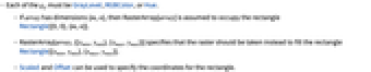 - If array has dimensions {m,n}, then RasterArray[array] is assumed to occupy the rectangle Rectangle[{0,0},{m,n}].