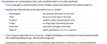 "BoundingBox" bounding box information for the raster "Data" the array of pixel values in the raster "Graphics" a graphics object representing the raster "Image" an image object representing the raster "RasterSize" pixel width and height of the raster "Regions" regions specified by Annotation constructs - Rasterize[expr] is equivalent to Rasterize[expr,"Image"] and displays in a notebook in a way that approximates the unrasterized display of expr, with the same image size.