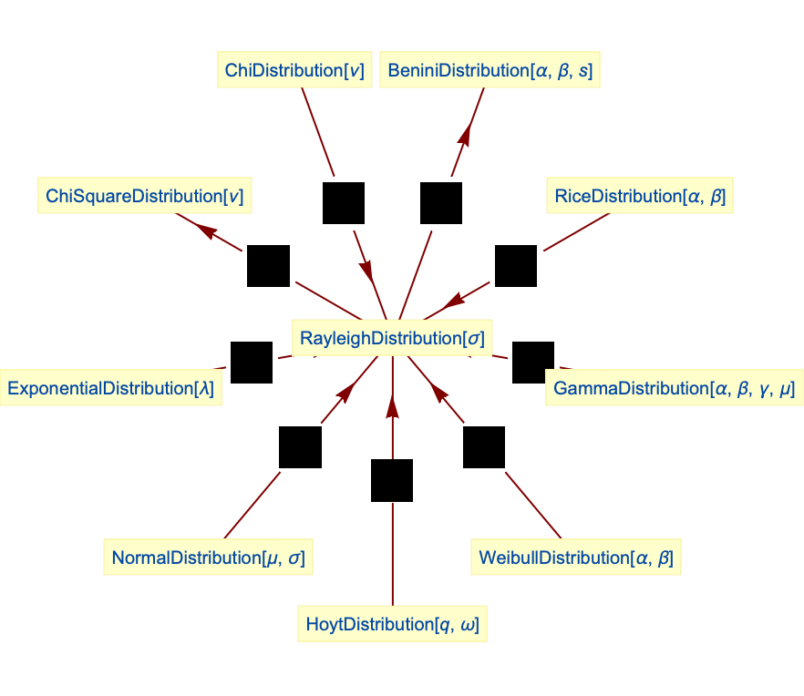 ], and moreover as a transformation (TransformedDistribution) of both ExponentialDistribution and BeniniDistribution. RayleighDistribution is also related to NormalDistribution, BinormalDistribution, LaplaceDistribution, SuzukiDistribution, LogNormalDistribution, and KDistribution.