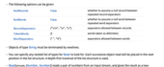 NullRecords False whether to assume a null record between repeated record separators NullWords False whether to assume a null word between repeated word separators RecordSeparators {"\r\n","\n","\r"} separators allowed between records TokenWords {} words taken as delimiters WordSeparators {" ","∖t"} separators allowed between words - Objects of type String must be terminated by newlines.