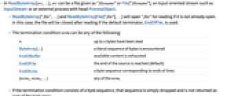 n up to n bytes have been read ByteArray[…] a literal sequence of bytes is encountered EndOfBuffer available content is exhausted EndOfFile the end of the source is reached (default) EndOfLine a byte sequence corresponding to ends of lines {term1,term2,…} any of the termi - If the termination condition consists of a byte sequence, that sequence is simply dropped and is not returned as part of the byte array.