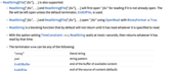 - ReadString["file",…] and ReadString[File["file"],…] will first open "file" for reading if it is not already open. The file will be left open unless the default terminator, EndOfFile, is used.