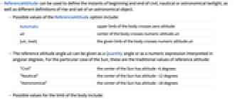 - ReferenceAltitude can be used to define the instants of beginning and end of civil, nautical or astronomical twilight, as well as different definitions of rise and set of an astronomical object.