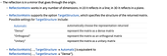 - ReflectionMatrix supports the option TargetStructure, which specifies the structure of the returned matrix. Possible settings for TargetStructure include: