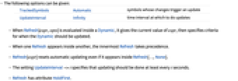 TrackedSymbols Automatic symbols whose changes trigger an update UpdateInterval Infinity time interval at which to do updates - When Refresh[expr,opts] is evaluated inside a Dynamic, it gives the current value of expr, then specifies criteria for when the Dynamic should be updated.