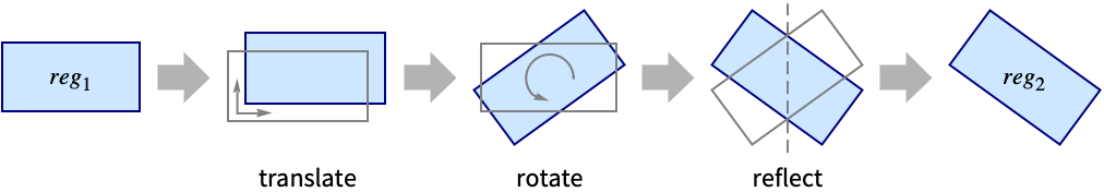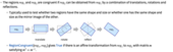 - RegionCongruent[reg1,reg2] gives True if there is an affine transformation from reg1 to reg2 with matrix m satisfying