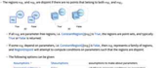 - If some regi depend on parameters, i.e. ConstantRegionQ[regi] is False, then regi represents a family of regions, and RegionDisjoint will attempt to compute conditions on parameters such that the regions are disjoint.