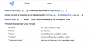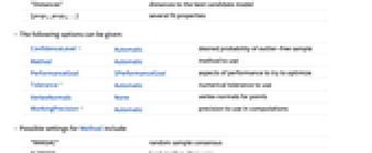 "BestFit" the best candidate model "Points" set of points "Inliers" points fitting the candidate model "Outliers" points not fitting the candidate model "DistanceVariance" variance of distances to the candidate model "Distances" distances to the best candidate model {prop1,prop2,…} several fit properties - The following options can be given: