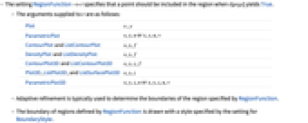 Plot x , y ParametricPlot x, y, u or x, y, u, v ContourPlot and ListContourPlot x, y, f DensityPlot and ListDensityPlot x, y, f ContourPlot3D and ListContourPlot3D x, y, z, f Plot3D, ListPlot3D, and ListSurfacePlot3D x, y, z ParametricPlot3D x, y, z, u or x, y, z, u, v - Adaptive refinement is typically used to determine the boundaries of the region specified by RegionFunction.