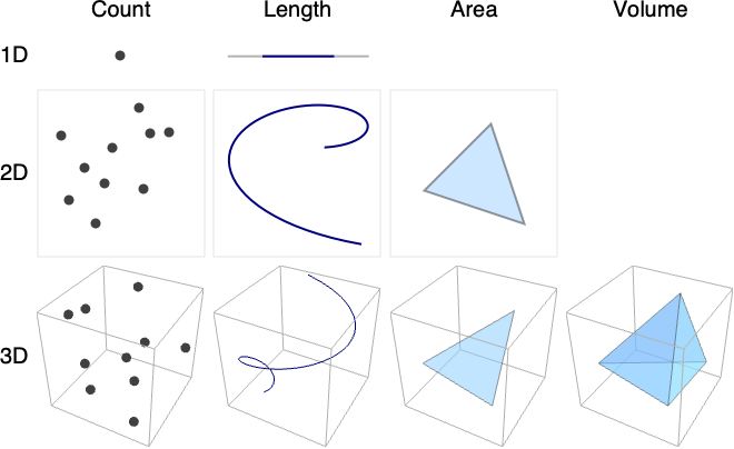 - The zero-dimensional measure counts the number of points in the region.