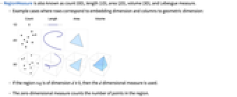 - RegionMeasure is also known as count (0D), length (1D), area (2D), volume (3D), and Lebesgue measure.