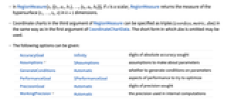 AccuracyGoal Infinity digits of absolute accuracy sought Assumptions $Assumptions assumptions to make about parameters GenerateConditions Automatic whether to generate conditions on parameters PerformanceGoal $PerformanceGoal aspects of performance to try to optimize PrecisionGoal Automatic digits of precision sought WorkingPrecision Automatic the precision used in internal computations - Symbolic limits of integration are assumed to be real and ordered. Symbolic coordinate chart parameters are assumed to be in range given by the "ParameterRangeAssumptions" property of CoordinateChartData.