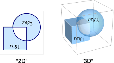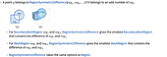 - A point p belongs to RegionSymmetricDifference[reg1,reg2,…] if it belongs to an odd number of regi.
