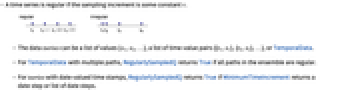 - For tseries with date-valued time stamps, RegularlySampledQ returns True if MinimumTimeIncrement returns a date step or list of date steps.
