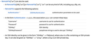 "Username" username to use for authentication "Password" password to use for authentication "SSHKey" SSH identity "SSHKeyPassword" passphrase string to used to decrypt "SSHKey" - An SSH identity can be given in the form "SSHKey"->File[ident], where ident is a file containing an SSH private key. It can also be given as "SSHKey"->"string", where string is an SSH private key.