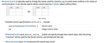 - RenameColumns is typically used to change the names used for columns, e.g. to avoid name conflicts or for clarity of communication. It can also be used to attach column keys to a Tabular object without them.